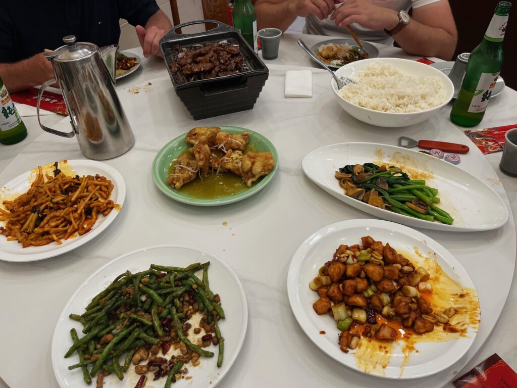 Und damit ging es dann auch zum Abendessen. Ein Lokal wo Einheimische Essen und wir zwei große Runde Tische bekommen haben. Schwein, Bohnen, Kartoffeln, Reis, Rind, mehr oder weniger Scharf und unheimlich lecker.