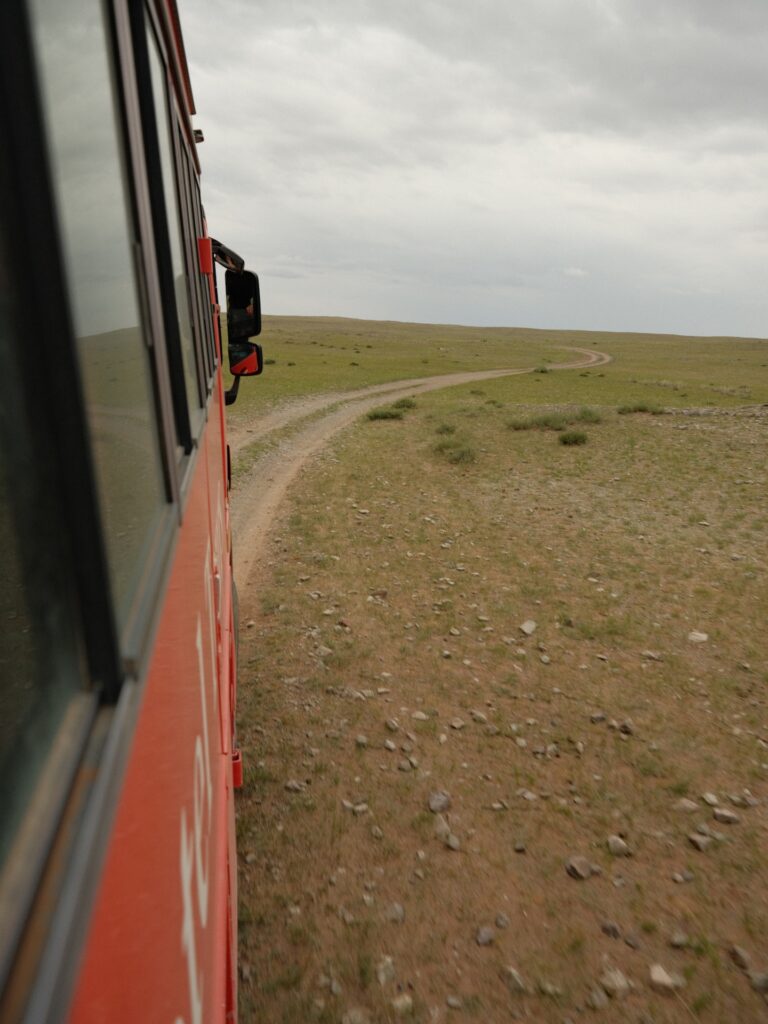 Jedenfalls müssen wir den Weg den wir gestern von der Straße nach Osten gefahren sind wieder zurück, naja zumindest grob die Richtung und etwas nördlicher halten. Es ist schon spannend, wie Pistenrouten und Wege entstehen. Irgendwann sind wir dann auf der Teerstraße und es ist teilweise ein wenig holprig. Dem einen oder anderen Mongolen erscheint das auch so und so fahren sie in den Spuren neben der Straße in die selbe Richtung.
