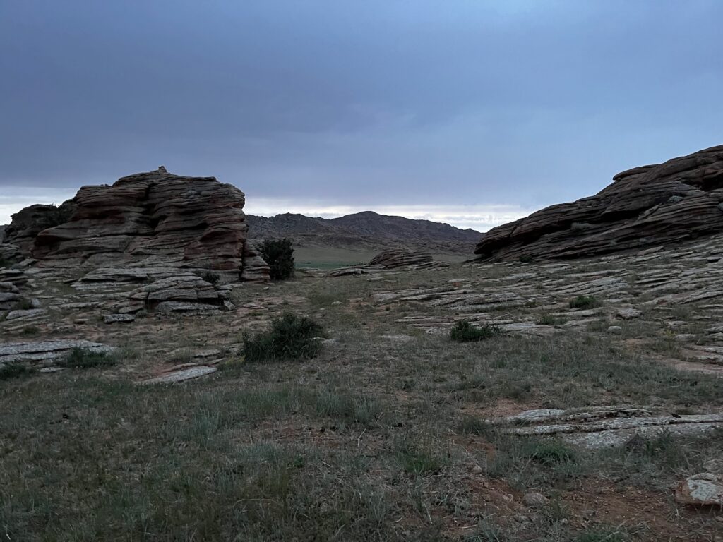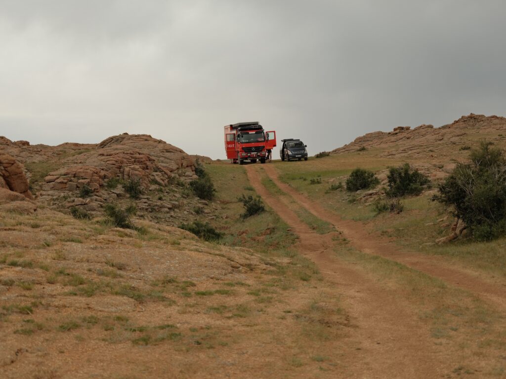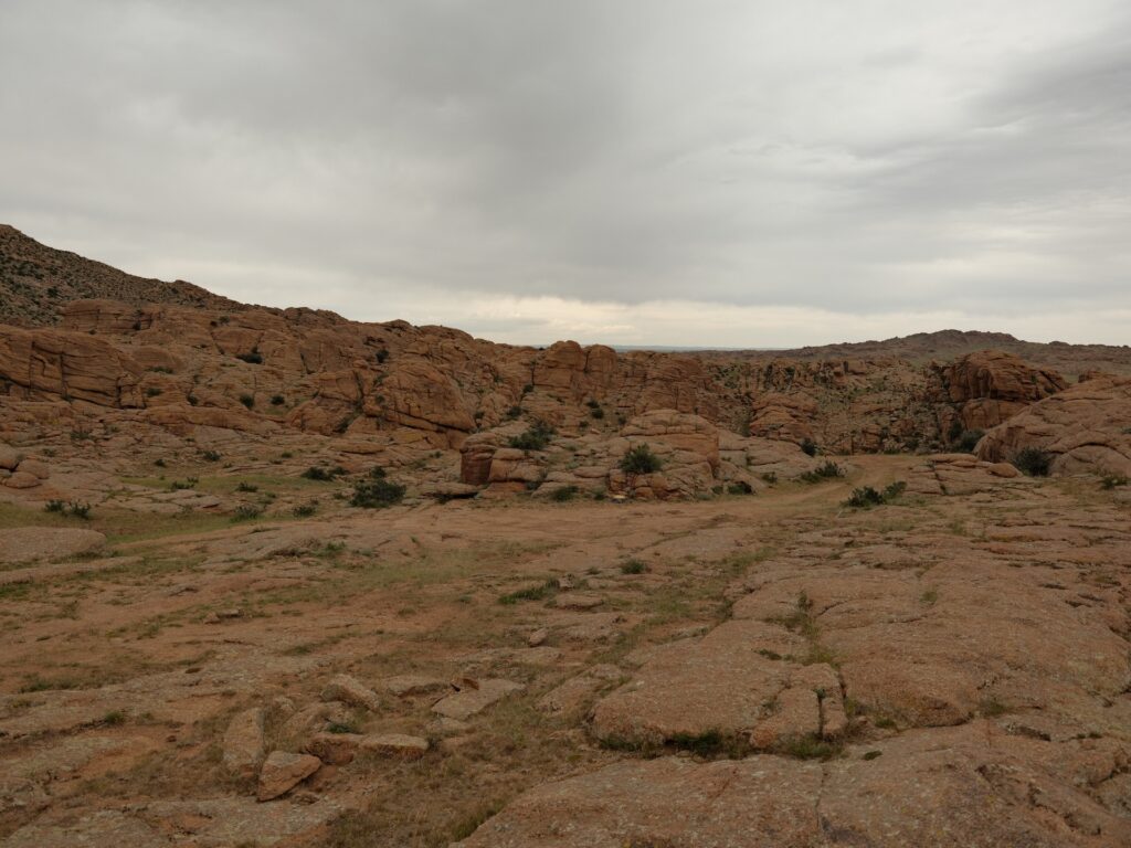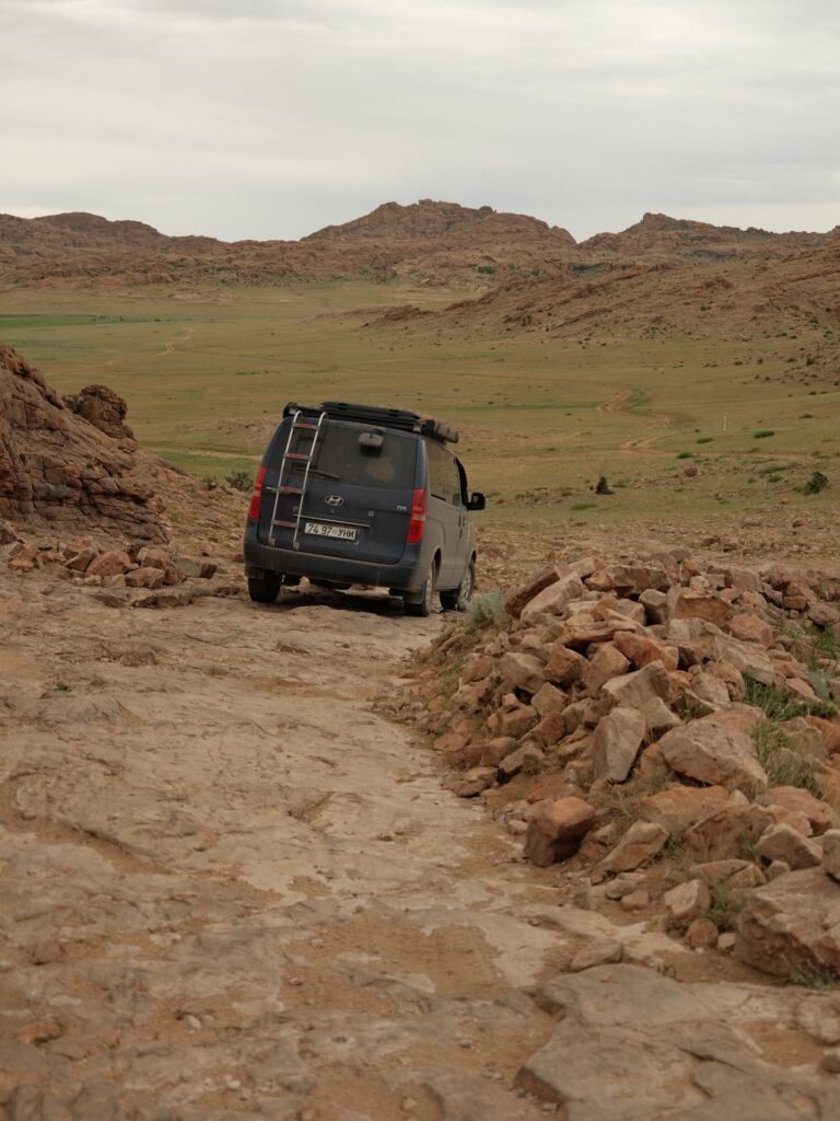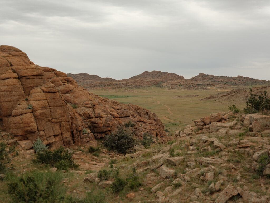 Eine beeindruckende Landschaft und den Weg da unten müssen wir nehmen, um zu unserem Platz für die Nacht zu kommen. Bei meinen Recherchen habe ich festgestellt, dass der Name nicht ganz korrekt ist und der Ort Baga Garziin Chuluu genannt wird.