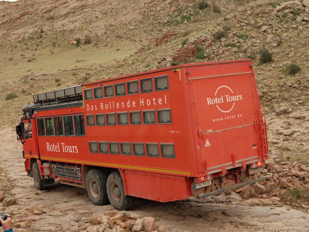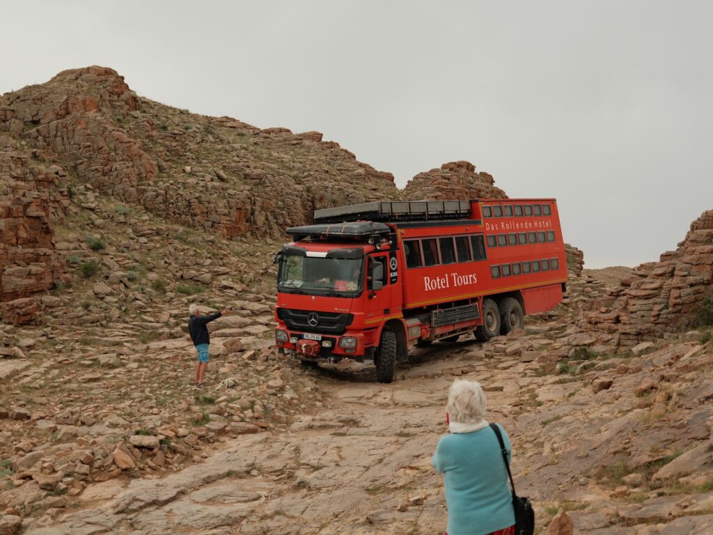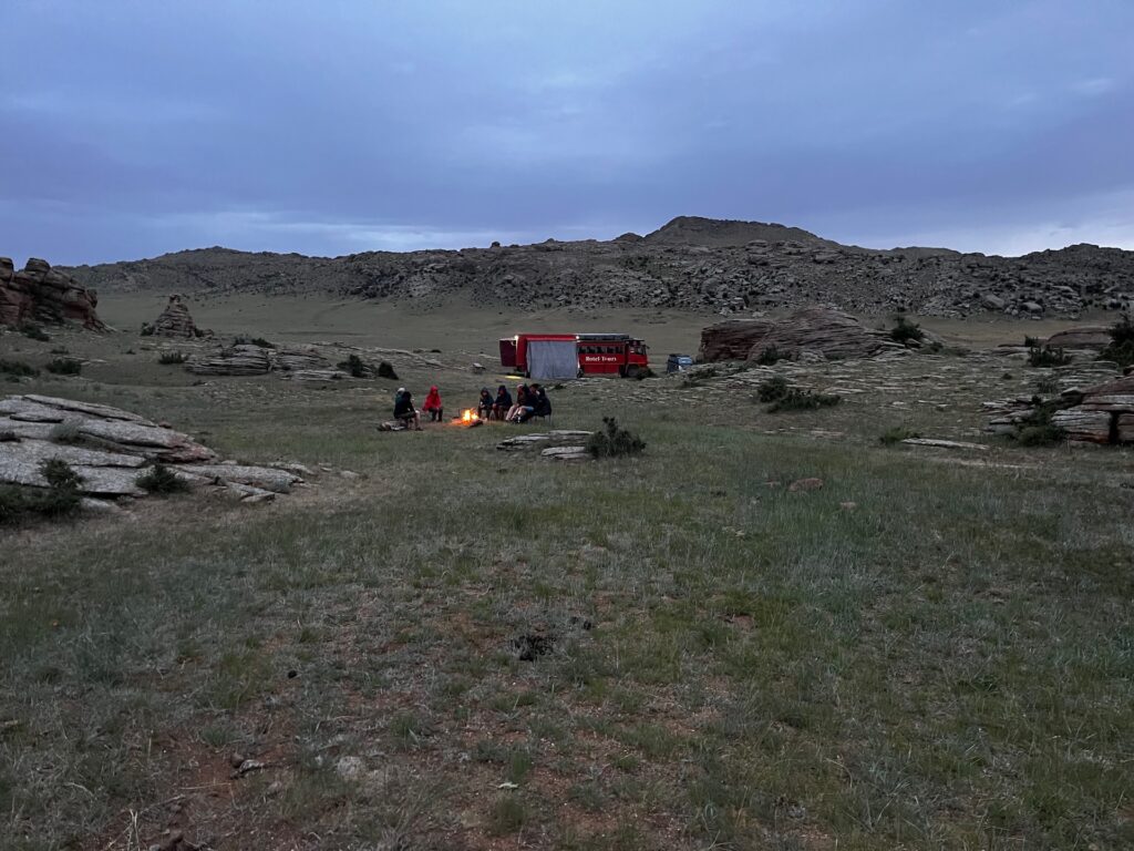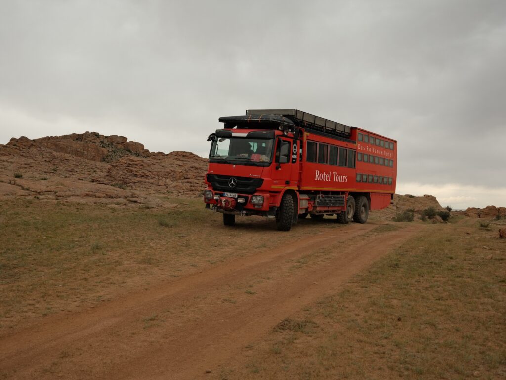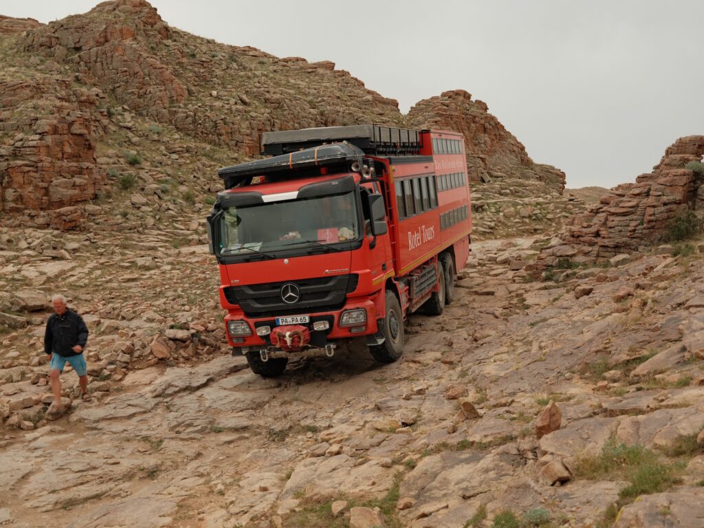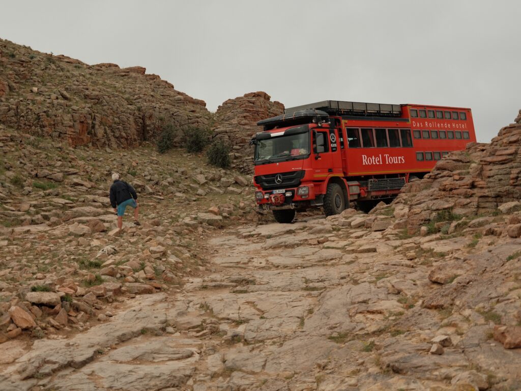 Eine beeindruckende Landschaft und den Weg da unten müssen wir nehmen, um zu unserem Platz für die Nacht zu kommen. Bei meinen Recherchen habe ich festgestellt, dass der Name nicht ganz korrekt ist und der Ort Baga Garziin Chuluu genannt wird.