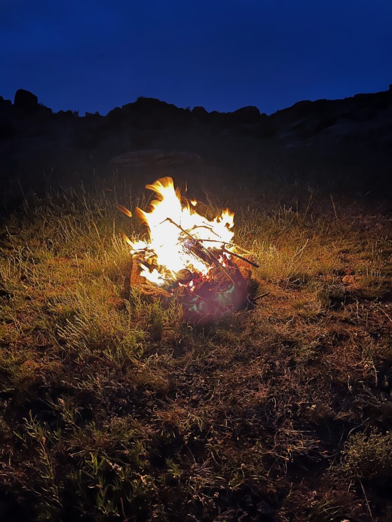 Es ist Abend und Wolken ziehen auf. Wir beschließen ein Lagerfeuer zu machen und so machen sich ein paar auf den Weg um Holz und Dung zu sammeln. Ich hätte nicht gedacht, wie gut das brennen kann.